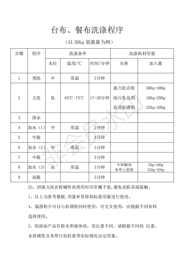 3) 分檢時最好將較臟的臺布與不太臟的臺布分開洗滌,臟臺布洗滌劑用量可多加些,不太臟的臺布洗滌劑的用量可減少些,這樣可節(jié)省用料量。