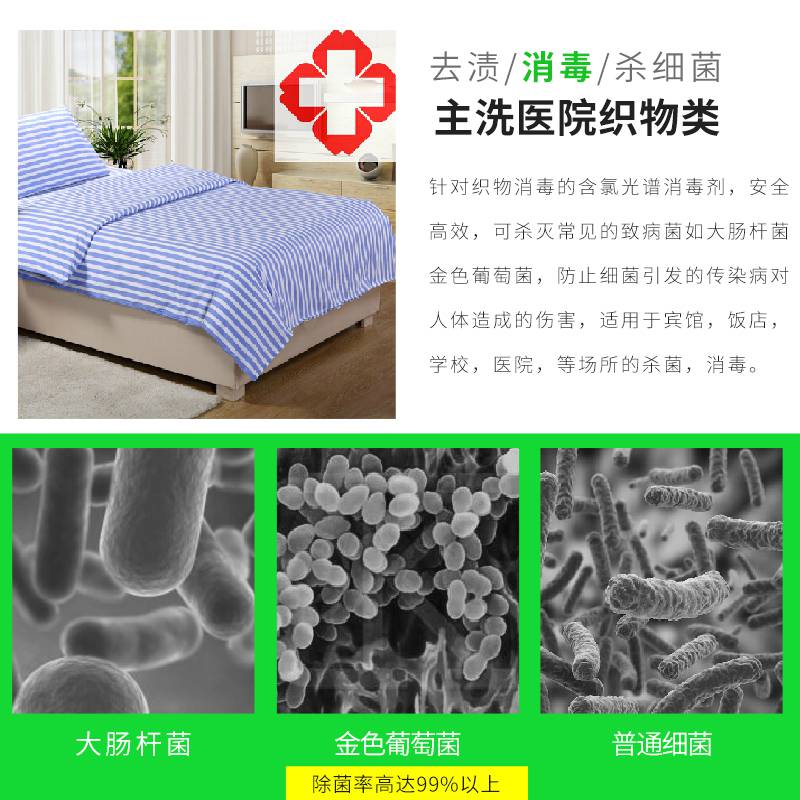產(chǎn)品描述:針對織物消毒的含氯光譜消毒劑,安全高效,可殺滅常見的致病菌如大腸桿菌、金色葡萄菌、防止細(xì)菌引發(fā)的傳染病對人體造成的傷害。